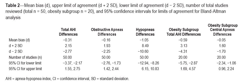 Bland-Altman plots were constructed and limits of agree- ment based on 2 SD of the mean difference were added to the plots for total AHI, obstructive apneas, and obstructive hypop- neas. No central hypopneas were scored. Subgroup analysis of total AHI and central apneas was performed for obese sub- jects. Mean bias (d), upper limit of agreement (mean bias +2 SD, lower limit of agreement (mean bias −2 SD), number of total subjects (n), and 95% confidence intervals for the limits of agreement of each Bland-Altman plot are listed in Table 2.