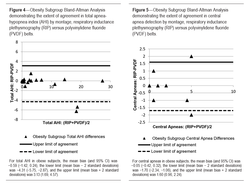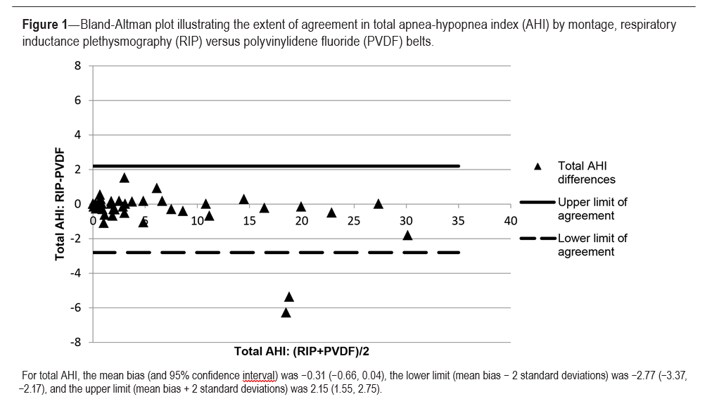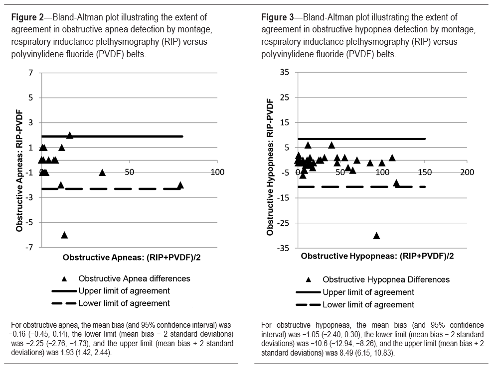 Results: Scoring of respiratory events was not significantly different by belt type based on Bland-Altman plots of total apnea-hypopnea index and obstructive apneas. Obstructive hypopneas scoring ranged beyond our clinical limit of agreement. Findings in obese subjects were consistent with the larger sample with the exception of an increase in outliers. Artifact amount was comparable (RIP 10.9% ± 22.5% and PVDF 10.5% ± 19.5%).