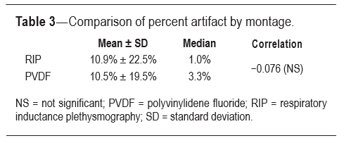 Contrary to our hypothesis that less artifact would be de- tected using PVDFb than with the use of RIPb, quantity of artifact was not statistically different. Although the amount of recorded artifact was comparable, it did not always occur in overlapping periods for PVDFb and RIPb, suggesting perhaps subtle differences in each belt’s susceptibility to artifact and signal disturbance.