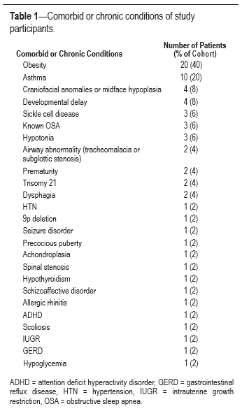 our cohort, more than half of the subjects presented with un- derlying chronic or comorbid conditions, and many children had more than one chronic disease or congenital abnormal- ity (Table 1). The most frequent comorbid conditions included obesity (40%, n = 20), asthma (20%, n = 10), developmental delay (8%, n = 4), and craniofacial anomalies (8%, n = 4).